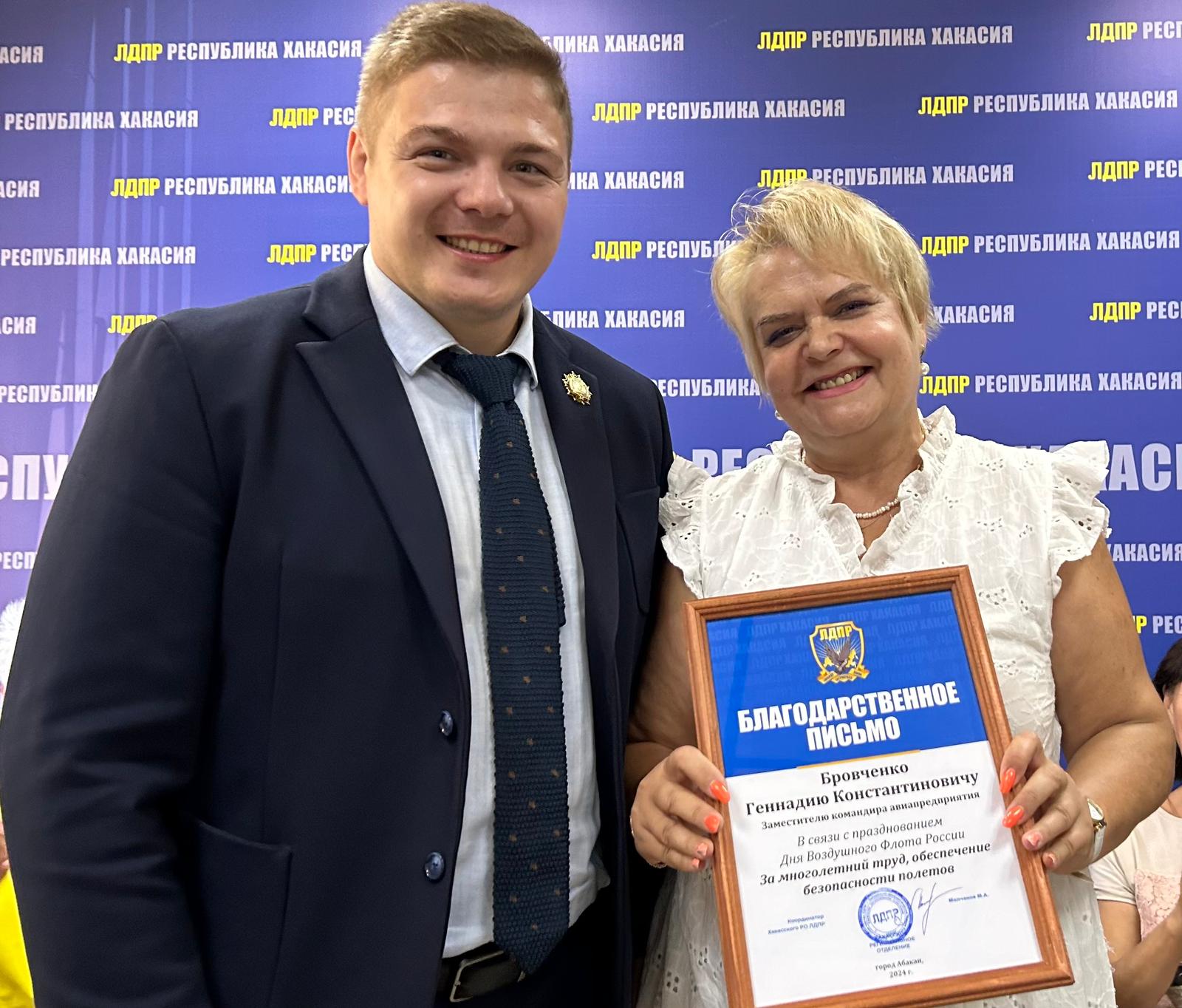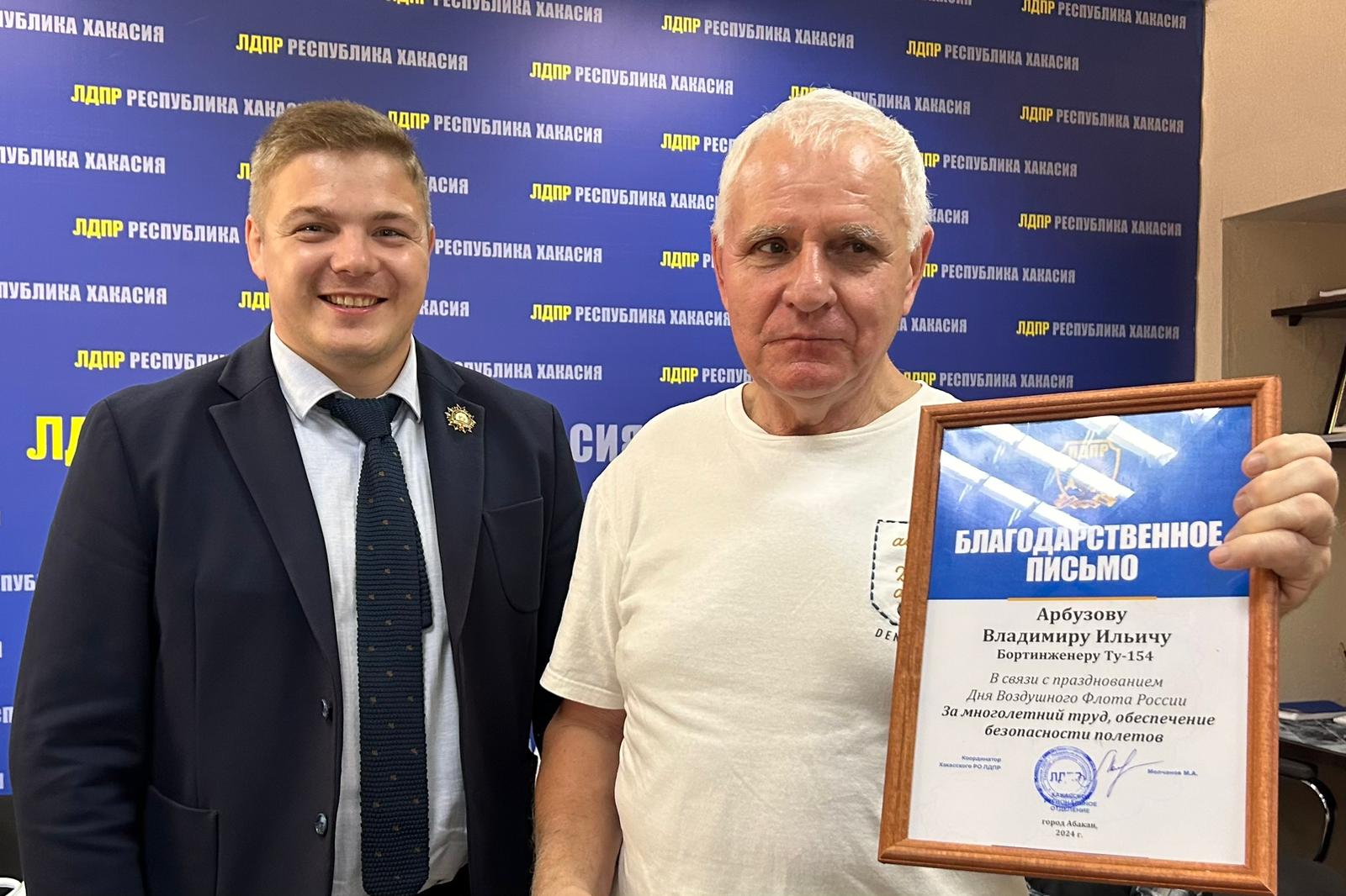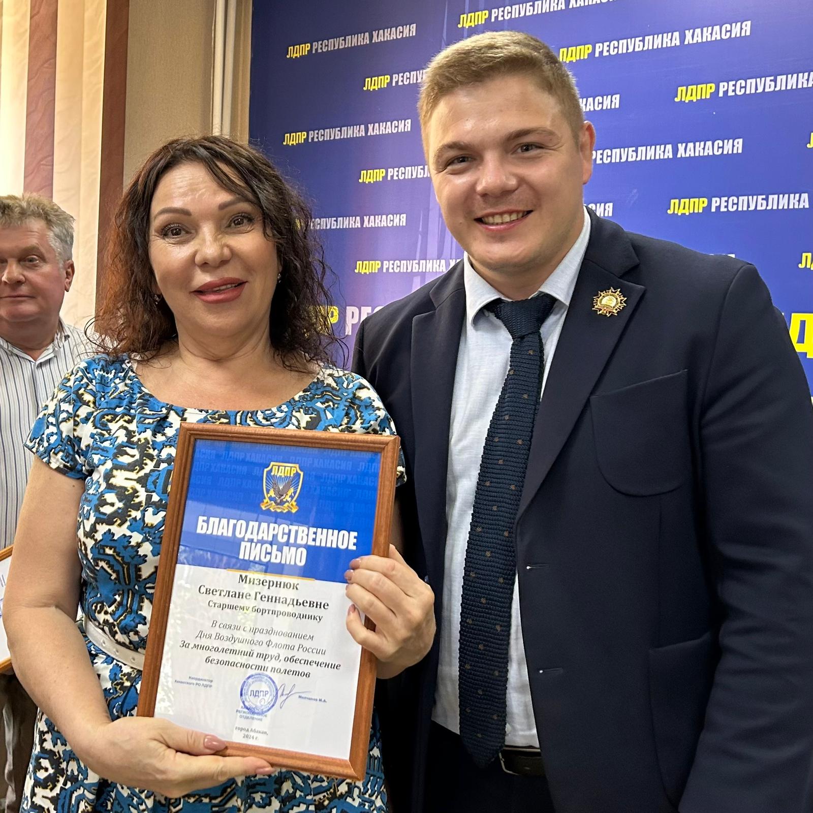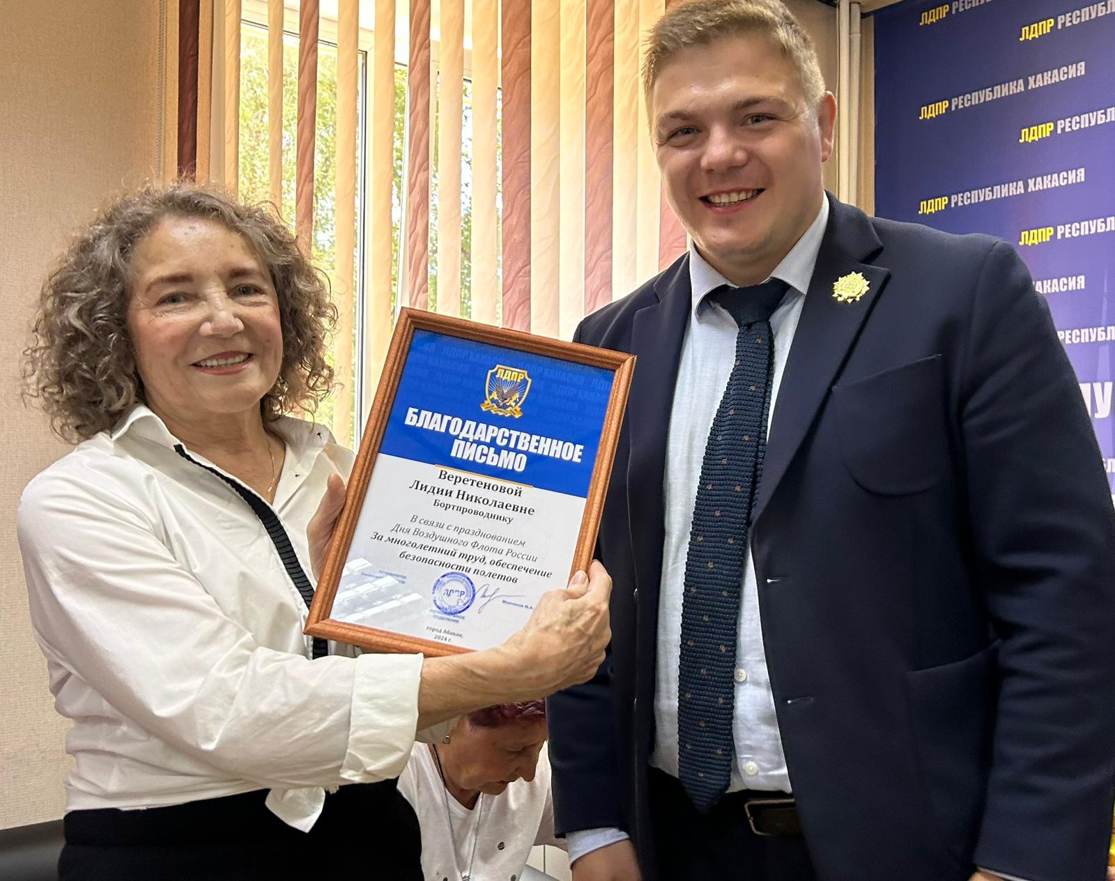 Благодарственные письма от ЛДПР Михаил Молчанов, координатор Хакасского регионального отделения ЛДПР, вице-спикер парламента вручил командирам судна, бортинженерам, бортпроводникам, всю жизнь отработавшим на пассажирских воздушных суднах, за многолетний труд и безопасные полеты.