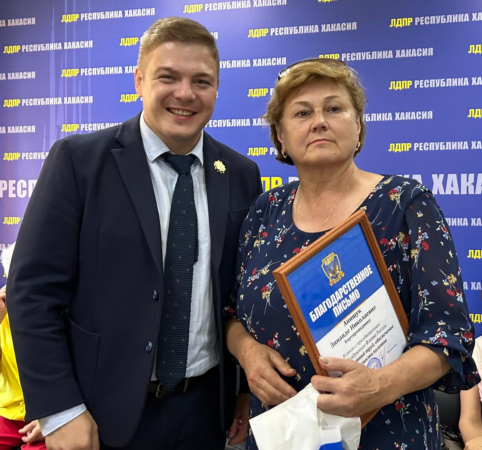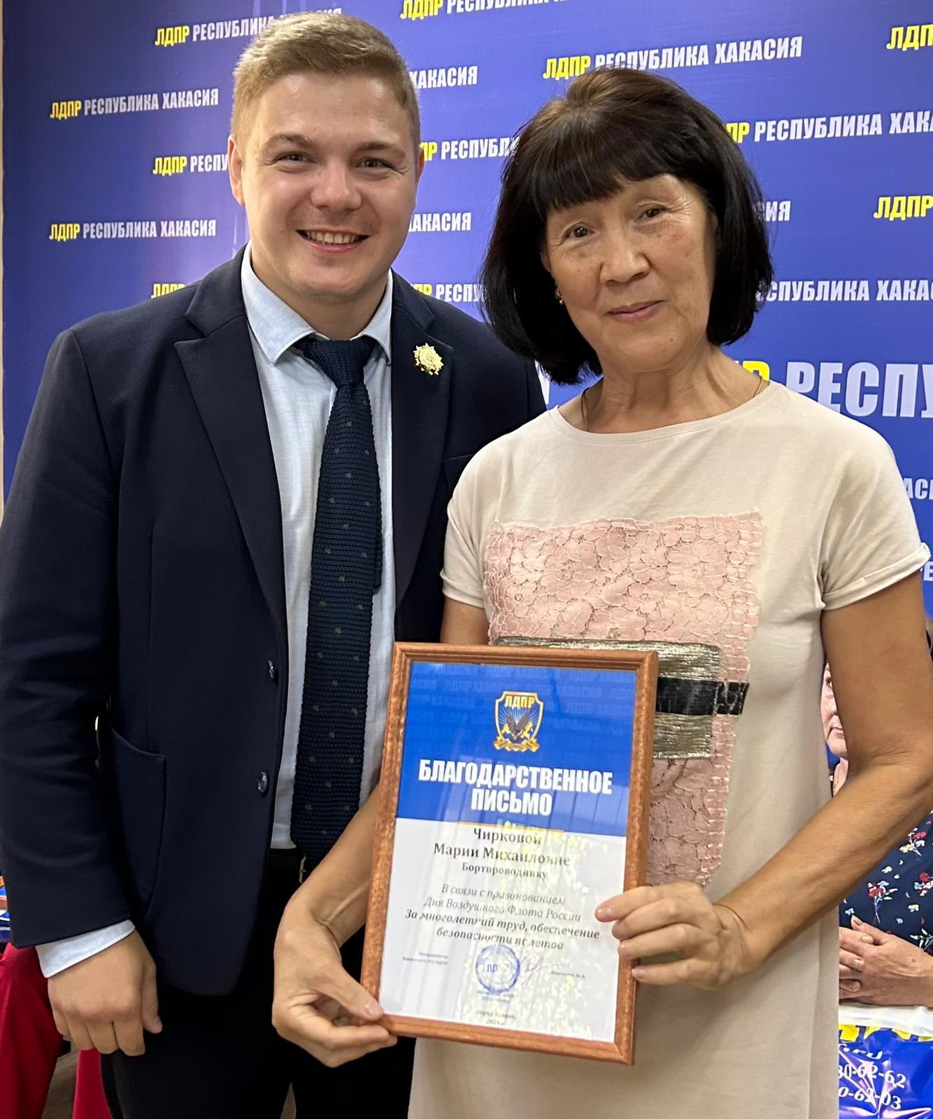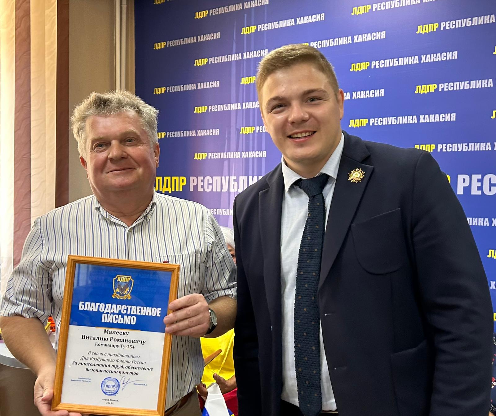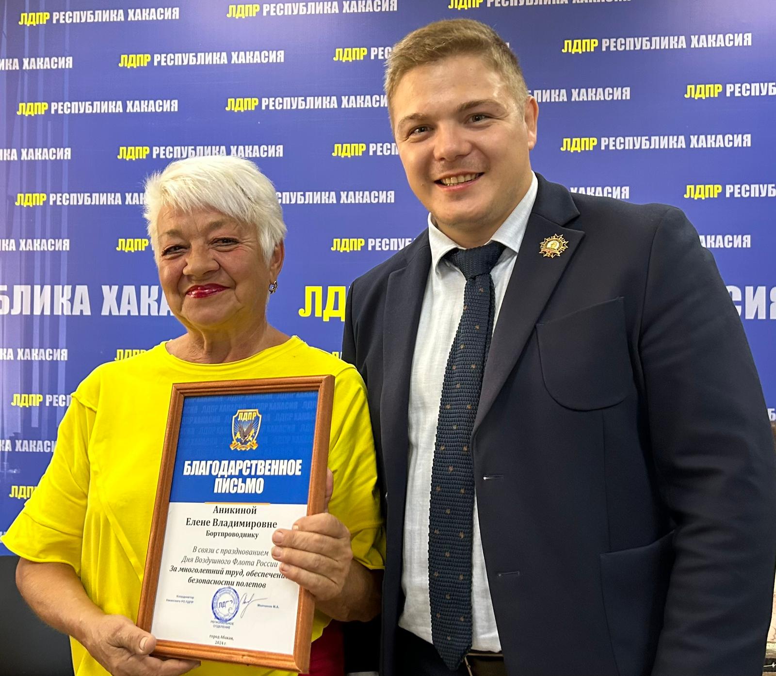 Благодарственные письма от ЛДПР Михаил Молчанов, координатор Хакасского регионального отделения ЛДПР, вице-спикер парламента вручил командирам судна, бортинженерам, бортпроводникам, всю жизнь отработавшим на пассажирских воздушных суднах, за многолетний труд и безопасные полеты.